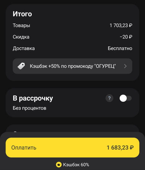 Господи, я вчера два раза пытался заказать - отменили оба раза, причем настолько все убого сделано что после отмены нельзя вернуть корзину, сиди собирай по новой. Сейчас собрал корзину, все ввел промокод, дошел до оплаты и ошибка ошибка. Перегрузил приложение вообще раздел в городе не открывается даже... Все это напомнило мегамаркет .....