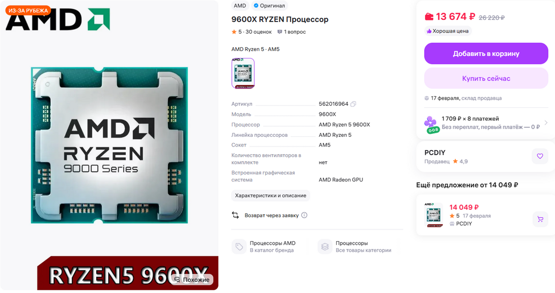 AMD Ryzen 5 7600 Процессор OEM (без кулера) https://ozon.ru/t/r...F9 за 9925 р. (Интересно) - кончились