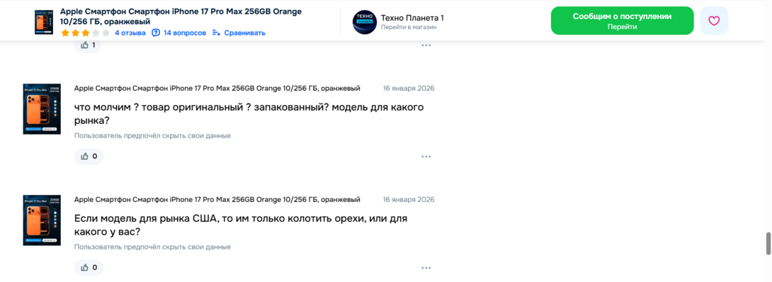 позавчера, тоже супер акция была странная по 92к, 6 штук за полчаса улетели с Озона! НО доставка только Курьер, и это очень сильно насторожило, в чем подвох? Везде цена 100к, но тут акция же ??? Пока закупал через сертификат Халва, цена выросла до 94, успел купить, на следующий день жду: Курьер получил товар, курьер едет к вам, курьер на месте! Однако этого пeтyшаpы не было и никто не звонил, я жду час, начинаю звонить курьеру, а там абонент не существует, жду 2, пишу продавцу и в поддержку, молчание на сутки, в общем кинули меня на Айфон 17 Про Макс, а днем тупо отменили заказ, думаю специально продаван делает накрутку профиля, а потом ноль отказов, и 5 звёзд, опечален такими мошенническими схемами