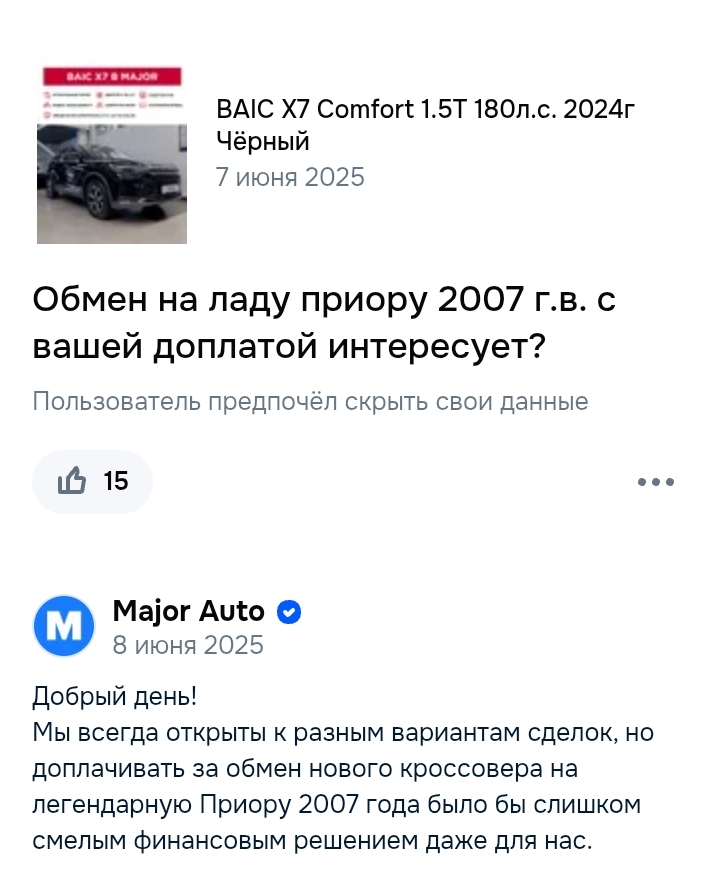 Major продает "ограниченную партию" с весны, если посмотреть сайт baic-major, там ~30-35 машин а наличии, что весной что сейчас, webarchive не даст соврать. Не зашла эта машина на наш рынок, странный бренд, странная комплектация... дилеры позакрывались, рестайл X75 уже только из Китая