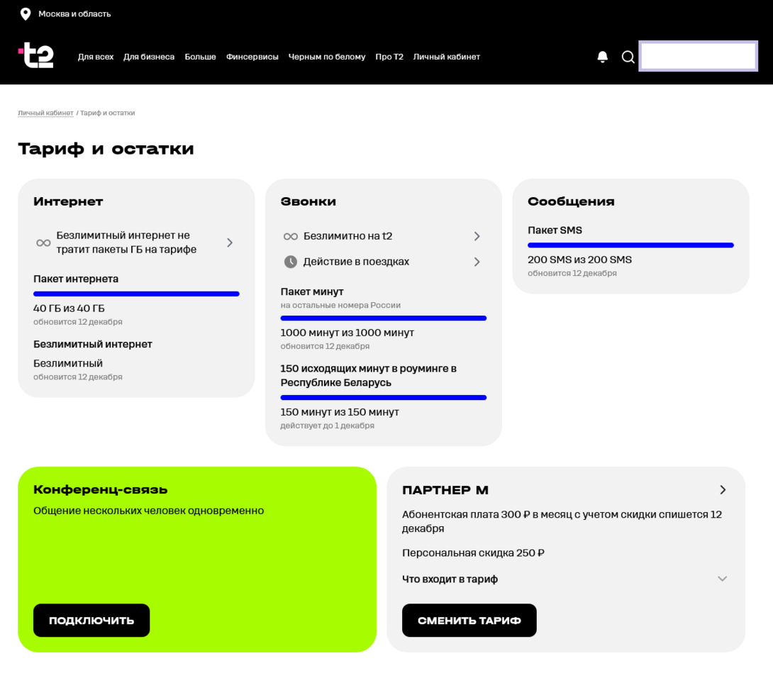 Тариф доступен только для новых подключений или переходов в Т2 со своим номером от другого оператора.