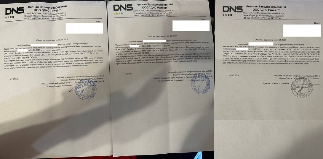 Маленькая победа! Сходил в днс, ознакомился с ответом на мою претензию, в общем предлагают как аналог gec 650, естественно это не аналог (60 мес. гарантия, не модульный, нет новомодных 12VHPWR или 12V-2x6), но управляющий работает с ПН по ПТ до 19, в выходные его нет, поэтому сказать что это