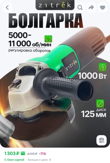 Домашняя страница/Болгарка Zitrek 1000Вт, диск 125 мм, с регулировкой скорости (с картой Ozon)