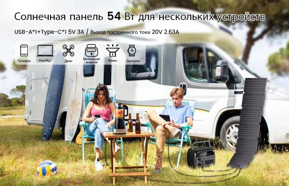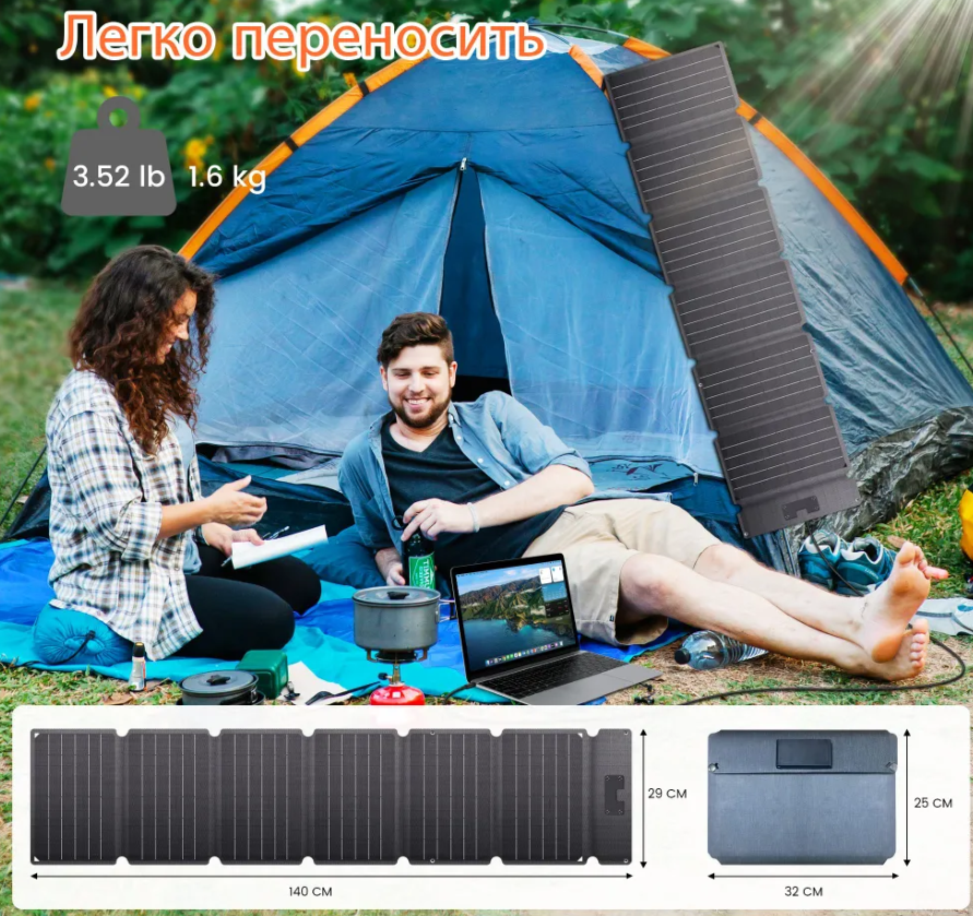 Габариты в свернутом виде:32 см на 25 см, в развернутом: 140 см на 29 см. Панель также оборудована мультипортовым контроллером для одновременного подключения до трех устройств: usb-a (5В 3А), type-c (5В 3А, + есть PD3.0 до 30ВТ ) и DC 5525(20В 2.63А).