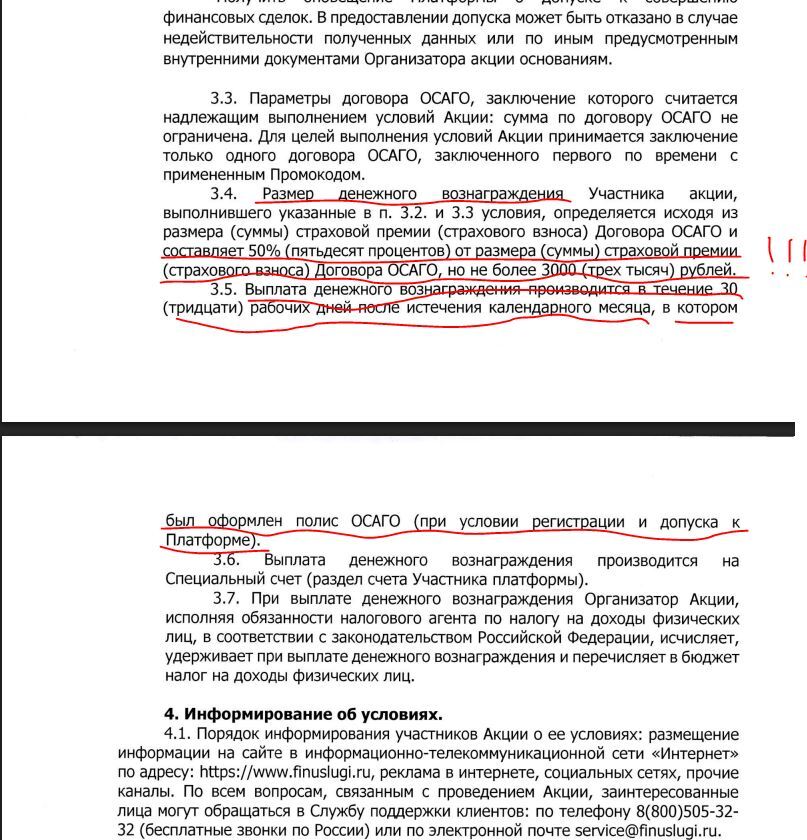 Занятные комменты про суммы возвратов.))))  Читайте условия акции. Например  при стоимости ОСАГО в 4200 никто вам 3000 не отдаст. Вернут 2100 и то могут почти через 2 месяца, если страхуете в начале месяца. !!! на ВАШ счет в Финуслугах . Если ОСАГО стоит 8 тысяч-вернут не более 3. А уж про уплаченные 5900 вместо 11600, даже комментировать не хочу.