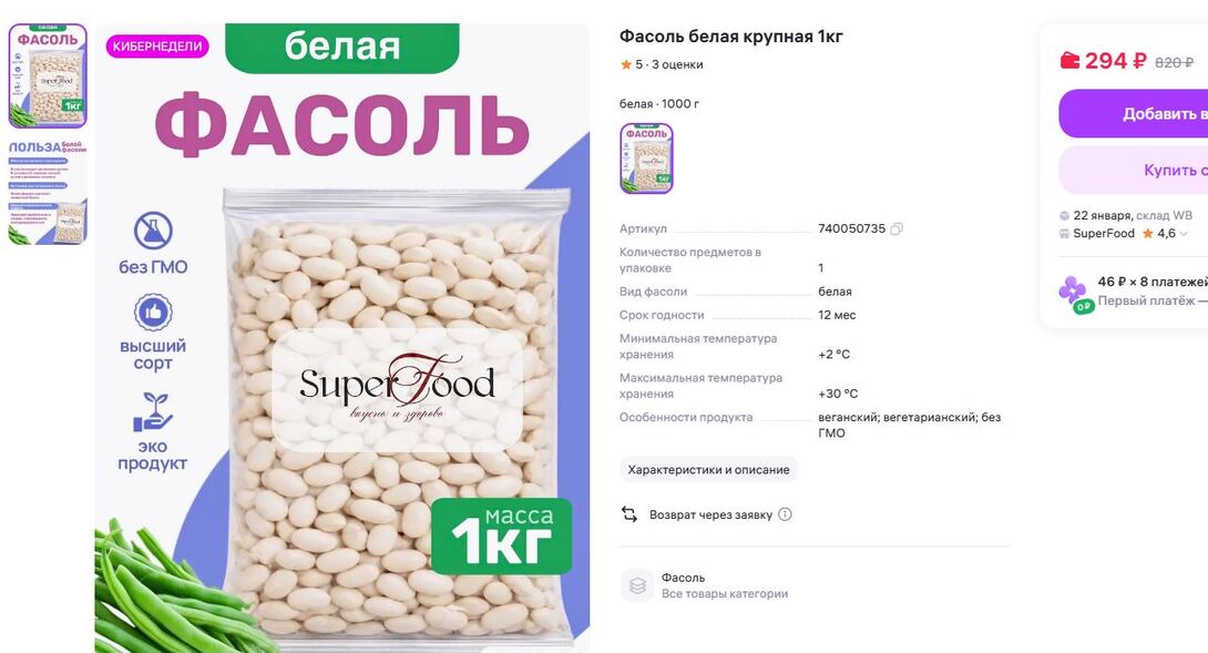 Фасоль белая 4 уп. х 450 г (c Ozon картой)