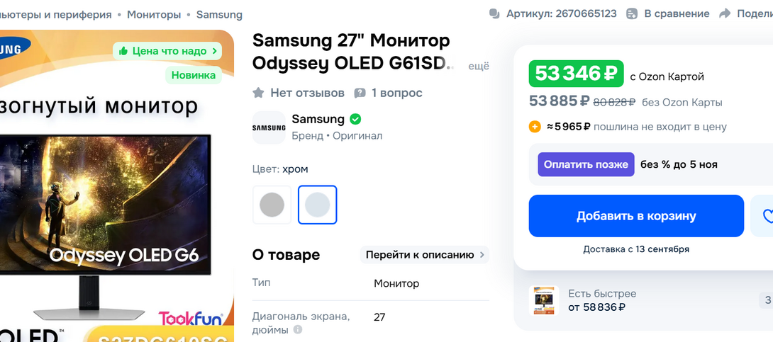 Домашняя страница/Игровой монитор 27" Samsung Odyssey G61SD, OLED, QHD, 240Гц (с Озон-картой, п...