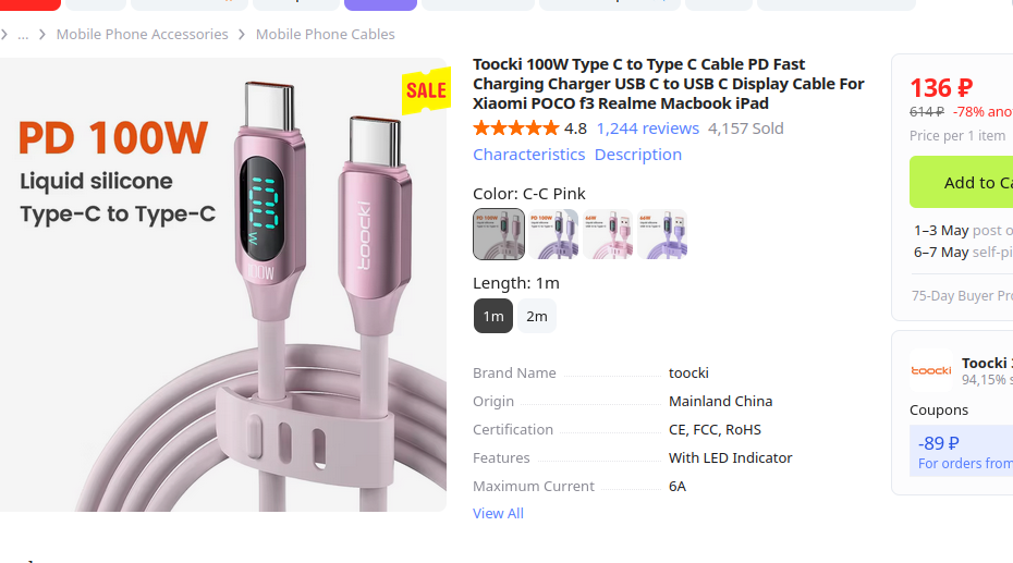 Там же можно задаром взять6A USB-A to USB-C Cable 66W