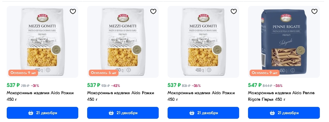 Возврат 100% кешбека на покупку макаронных изделий бренда AIDA в Т-Банке