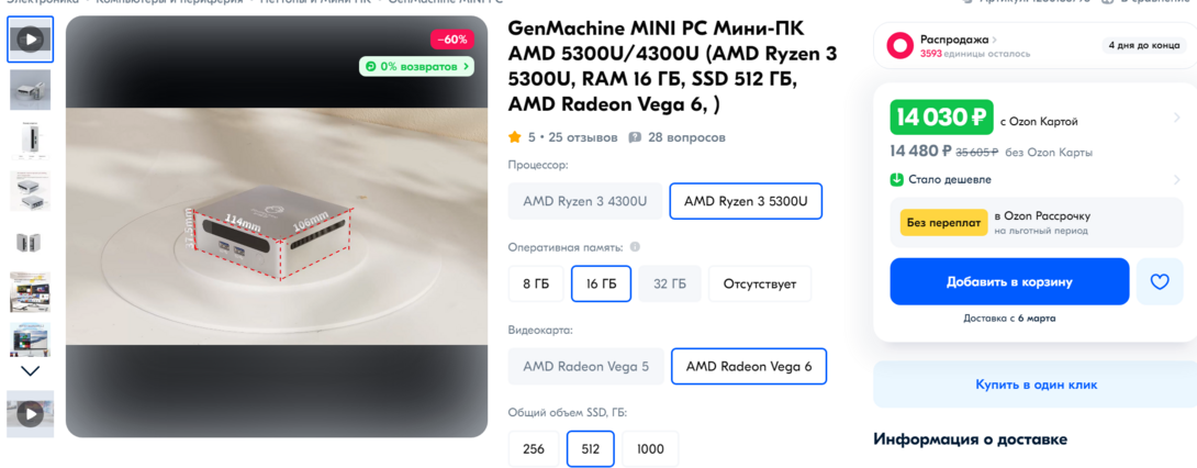 Там ещё есть вариант без RAM/ROM за 10978₽, но на этот корпус есть не очень хорошие отзывы (с другими процессорами), так что GenM получше будет думаю https://www.ozon.ru/product/mi...