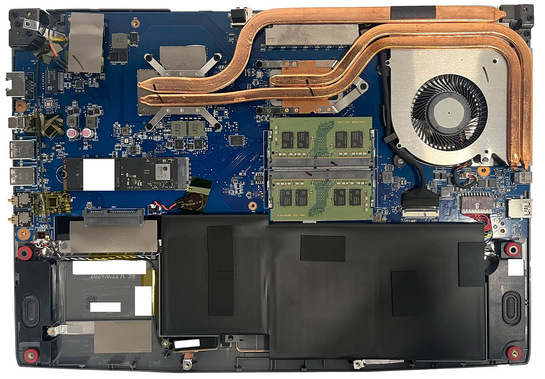 Примерно такая начинка. 1 вентилятор. Понятно почему урезанный теплопакет у видеокарты. И маленький аккумулятор(52.4 втч(. Понятно почему он легкий. По сравнению с Gigabyte A16 с ссд 1тб, АКБ 76втч, ртх5050@85W и и7-13620н который продавался за 63к на прошлой неделе выглядит блекло. Хорошая цена бы была ниже 50к. Зато есть место под 2.5» накопитель