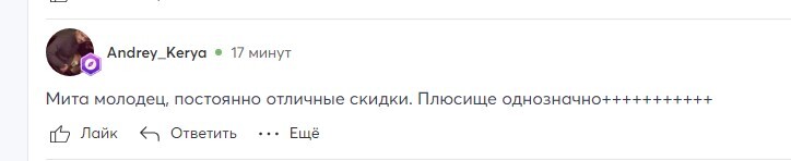 Мита молодец, постоянно отличные скидки. Плюсище однозначно+++++++++++
