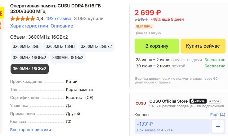 Купил в апреле за 2527 руб. 16х2 3600 МГц.