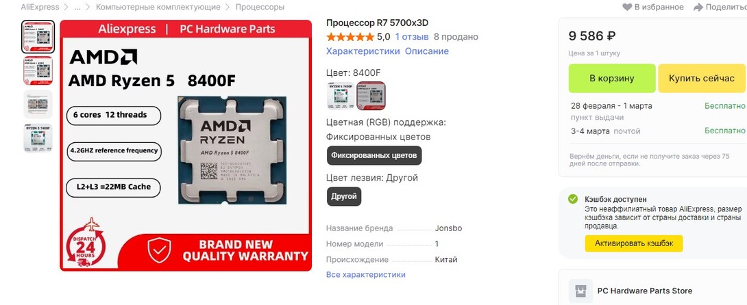В этом же лоте есть 8400f за 9 586 руб. и 7400f за 12 710 руб., что весьма недорого на сегодняшний день.