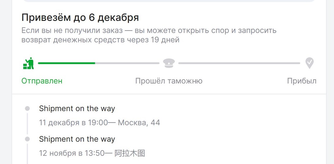 Внезапно статус обновился через месяц, пишут 11 декабря в Москве, при этом до сих пор нет отметки о прохождении таможни.