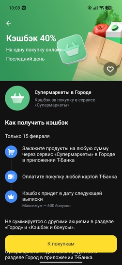 Суммируется с повышенным кешбеком на продукты в городе еще, итого 35%