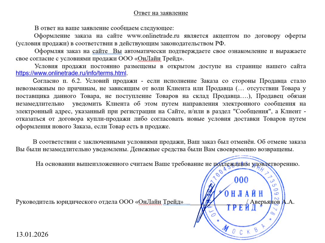 Здравствуйте, пришел ответ от ОТ, странно что в досудебки явно написано что заказ оформлен через Яндекс а в ответе пишут что на сайте.