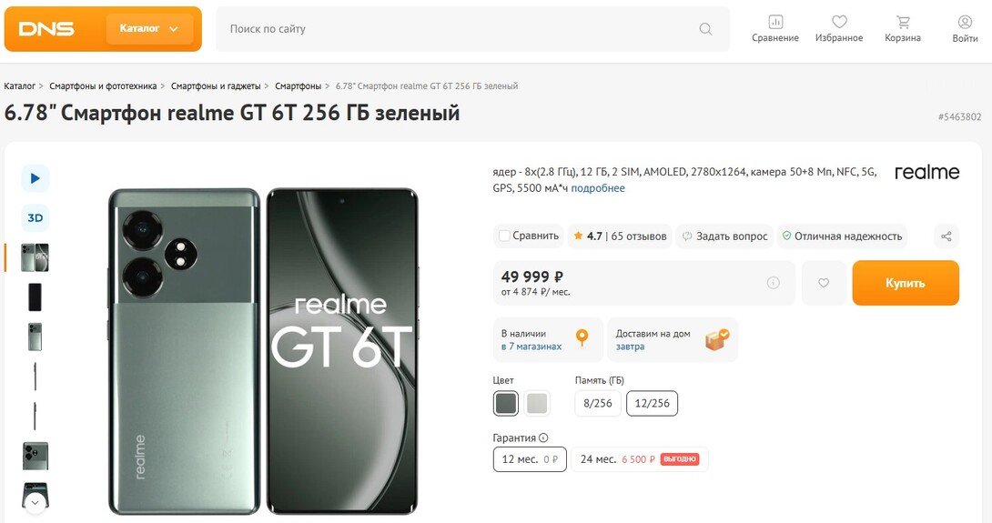 Домашняя страница/Смартфон realme GT 6T, NFC, Global, 12/256 ГБ, серебристый (из-за рубежа, с O...