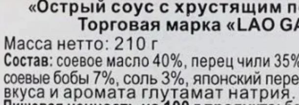 Состав: рафинированное соевое масло,перец чили, ферментированные соевые бобы (соевые бобы, вода, соль), соль, усилитель вкуса и аромата - глутамат натрия 1-замещенный, сахар.