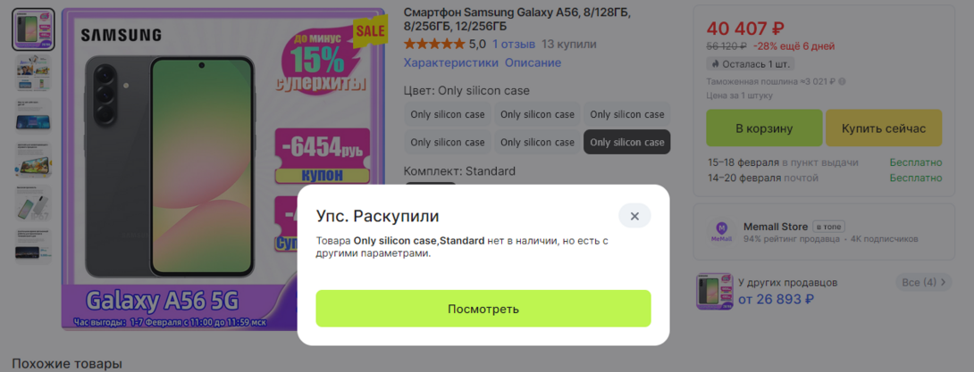 Схема такая-добавляете самсу 8-256 в корзину за ним 12-256 любого цвета который в наличии,выделяете для покупки 12-256 справа высветиться надпись "скидка за опт" и цена в районе 16000 и быстро оплачиваете)))))) не забывайте применить купоны магазина....))))))