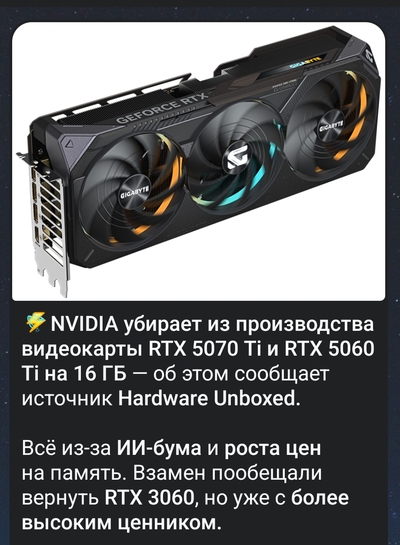 ⚡NVIDIA RTX 5070 Ti и RTX 5060 Ti на 16 ГБ убирают из производства – Hardware Unboxed.