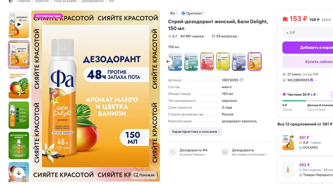 З22 рубля за набор из 3-х стеклянных бутылочек по 50 мл каждая. Одна бутылочка обойдётся в 108 рублей – Женский роликовый дезодорант Фа Ритмы Острова Бали Delight (аромат манго и цветка ванили). Время работы дезодоранта 24 часа: