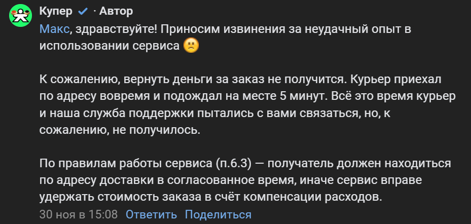 Куперу было мало периодического воровства заказов, им было мало "ополовиненных" по дороге заказов, теперь пошли официальные ответы "х...р тебе! Ни заказа, ни денег не получишь"