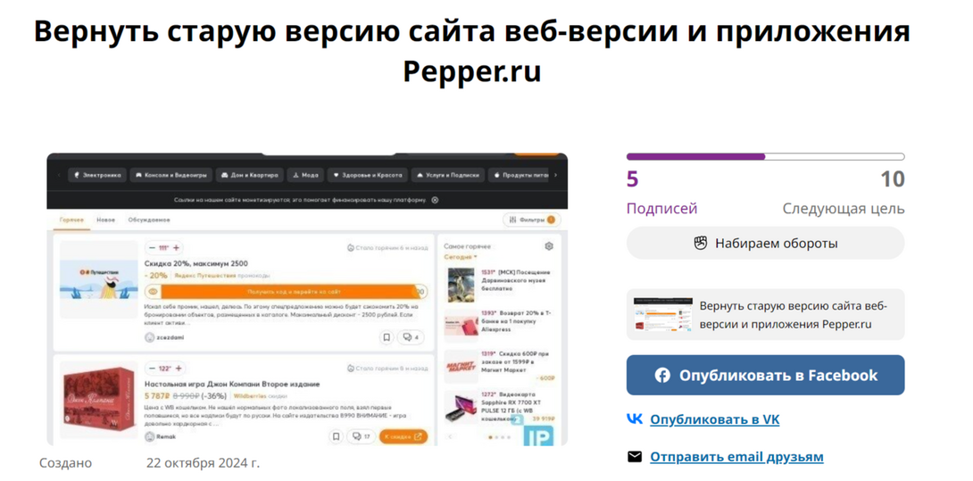 Петиция ниже на возврат старой версии сайта на сайте Change.org
