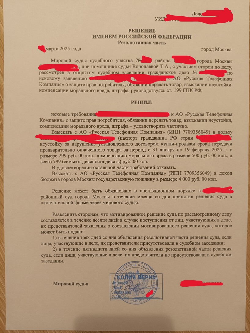 Ну в свете открывшихся событий суд долго не длился, решение вынесено в мою пользу, смартфоны я получил по восстановленным заказам. Суд также назначил копеечную неустойку 299руб и моральный 500руб. Конечно как некоторые могли заметить, суд неправомерно не назначил ответчику штраф, хотя он должен быть и немного неправильно рассчитал неустойку в меньшую сторону, но учитывая потенциальную разницу в лишние 600руб обжаловать я конечно же не стал.