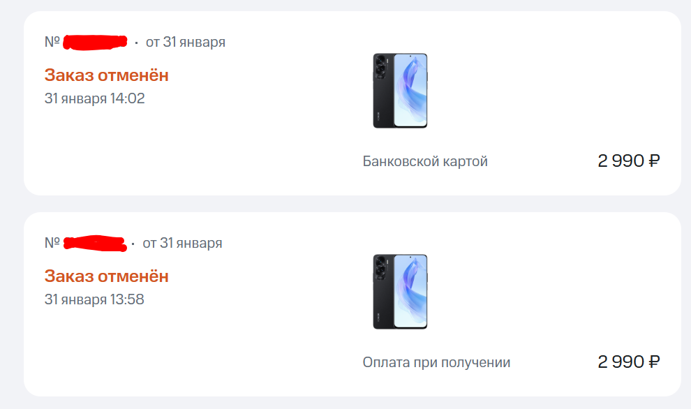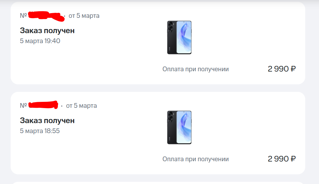В феврале этого года были оформлены 2 заказа на смартфон Honor 90 Lite 8/256гб(1 заказ на 1шт и 2заказ на 1шт). Стоимость смартфона при заказе на сайте составила 2990руб за штуку при средней розничной на тот момент 23990.