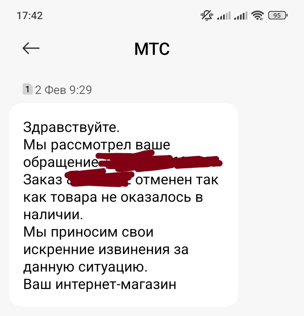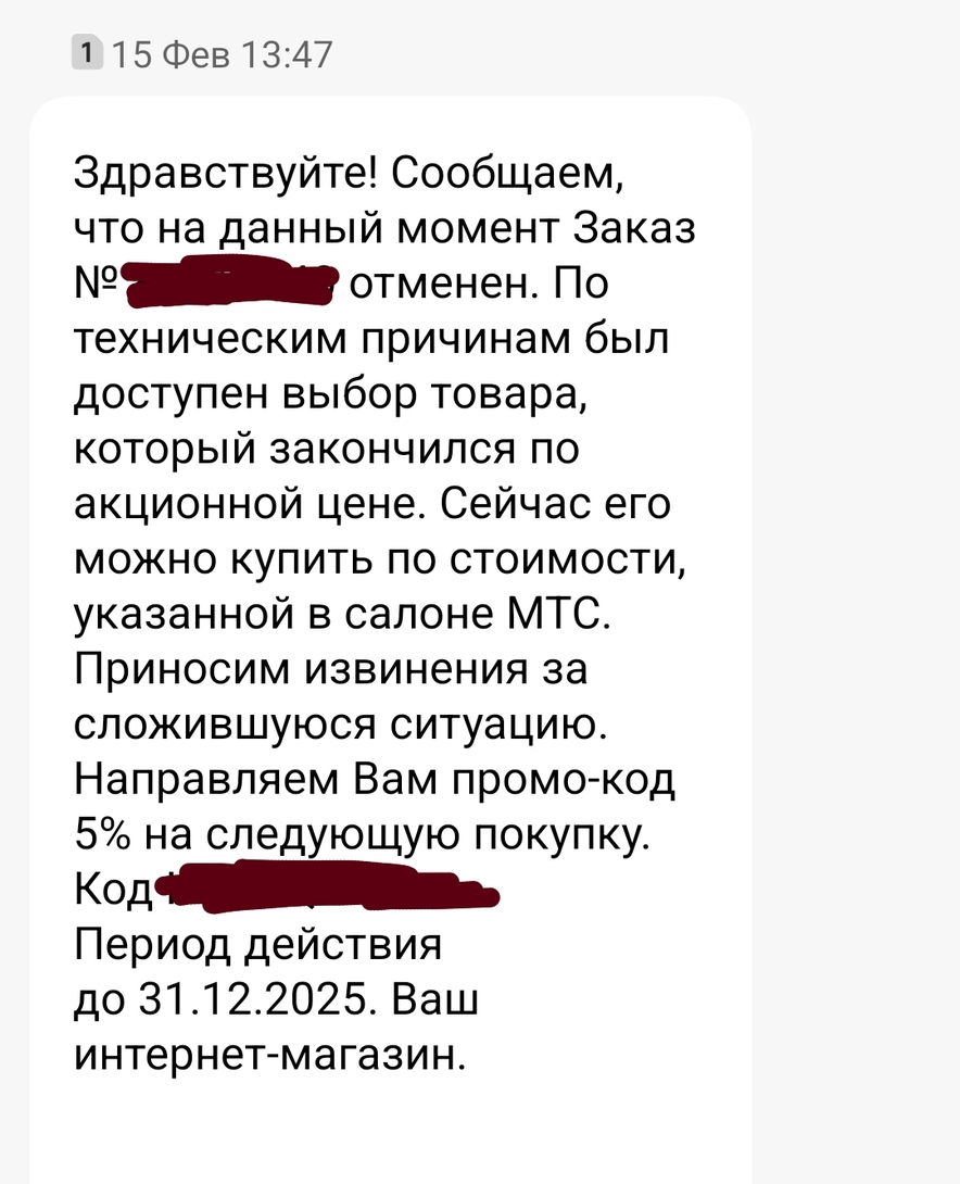 Уже на пути в первый салон, мтс видимо прочухали, что с ценой что-то не так и молча отменили оба заказа, прислав мне лишь смс сообщения об отмене без каких-либо пояснений причин. Причем сразу же страница товара была полностью удалена с сайта.