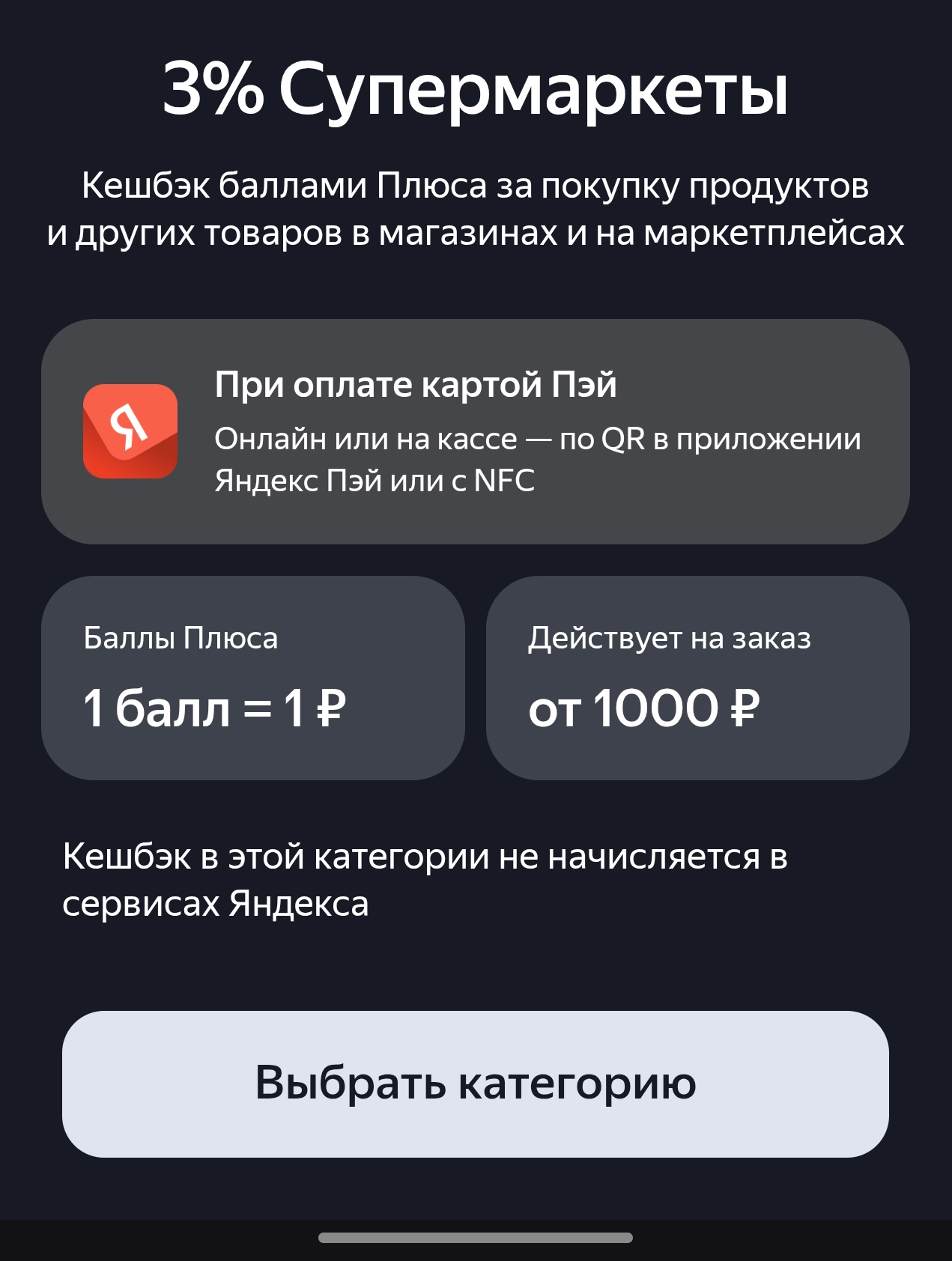 У меня яндекс на март дал один тухляк в категориях кэшбека, как и в феврале. Походу сдувается... Супермаркеты давали в декабре, про 1000+ было написано.